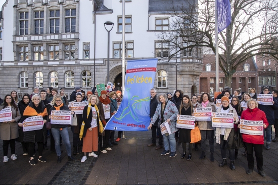 Um 12 Uhr waren am Freitag, 25. November, viele Gladbecker:innen auf dem Willy-Brandt-Platz vor dem Rathaus zusammen gekommen, um im Rahmen der Fahnenaktion unter dem Motto „Nein zu Gewalt an Frauen und Mädchen – Frei Leben – ohne Gewalt“ gemeinsam mit dem 1. Stellvertretenden Bürgermeister Norbert Dyhringer, der Landtagsabgeordneten Christin Siebel sowie der Gleichstellungsbeauftragten der Stadt Gladbeck, Ulla Habelt, und der Frauenberatungsstelle Gladbeck e. V. die Fahnen gegen Gewalt an Frauen und Mädchen mit Unterstützung der Taiko-Trommler:innen zu hissen. Die Gleichstellungstelle sorgte für süße Verpflegung und backte Waffeln gegen eine kleine Spende für die Frauenberatungsstelle.
