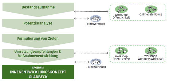 Um diesem Ziel näher zu kommen, wird derzeit in Zusammenarbeit mit den Stadtplanungsbüro Post Welters Partner ein Innenentwicklungskonzept erarbeitet, welches diverse Beteiligungsmöglichkeiten bietet.