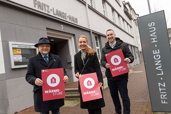 (Foto: Sozialdezernent Rainer Weichelt, Bürgermeisterin Bettina Weist und Abteilungsleiter Marcel Hädrich vor dem Fritz-Lange-Haus, das zukünftig auch als Wärmestube dient.)