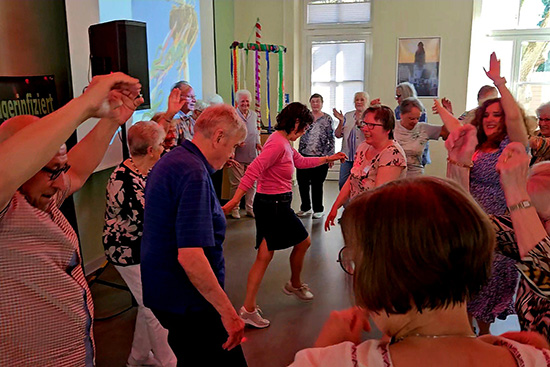 Musiker Wolkenberg entfachte mit seinem Programm „schlagerinfiziert“ sofort Begeisterung. Unter einem bunt geschmückten Maibaum wurde zu Walzer, Foxtrott und Discofox getanzt, geklatscht und gesungen. Eine würzige Spargelcremesuppe und der spritzige Aperitif Hugo sorgten für Stärkung und rundeten das gesellige Beisammensein ab.