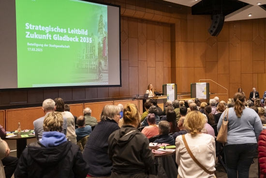 Rund 100 Gladbecker:innen kamen am Montagabend, 17. März, in der Mathias-Jakobs-Stadthalle zusammen, um aktiv an der Entwicklung der Zukunftsstrategie „Gladbeck 2035“ mitzuwirken.